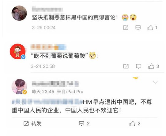 傍晚,黃軒、宋茜先后宣布終止與H&M集團(tuán)的合作關(guān)系,淘寶京東等電商平臺(tái)下架H&M相關(guān)商品等消息相繼登上微博熱搜,主流媒體也紛紛發(fā)聲,繼續(xù)推高話題熱度?!暗种菩陆a(chǎn)品的同時(shí)還想賺中國人的錢?癡心妄想” “品牌不能一邊干著傷害中國的事情,一邊在中國賺得盆滿缽滿”等評(píng)論頻現(xiàn)。