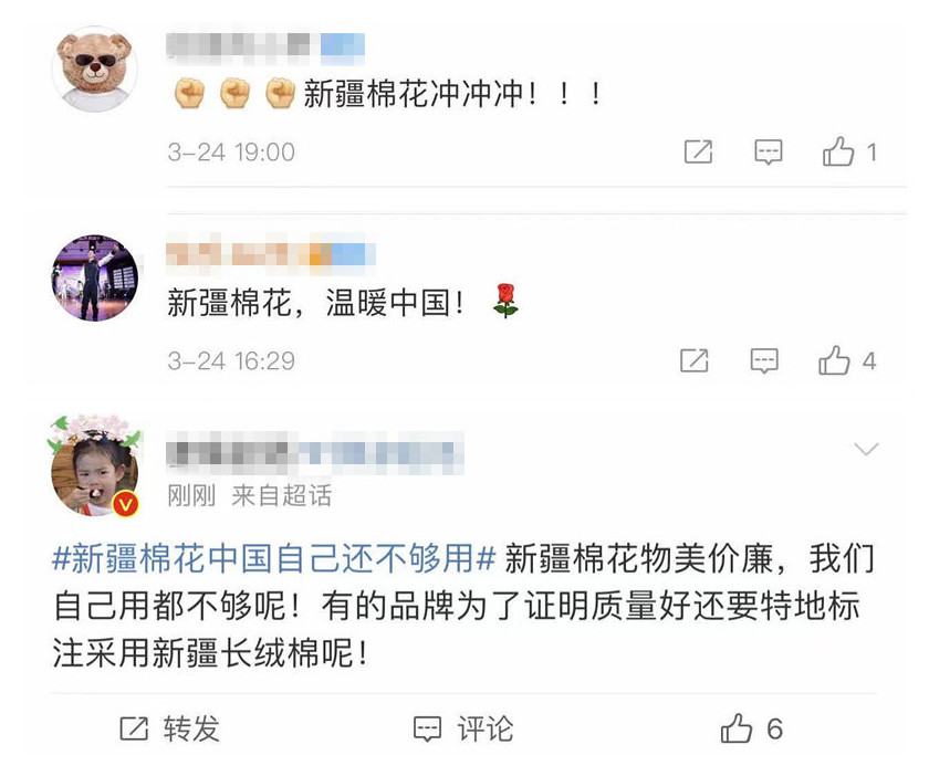隨著事件的發(fā)展,網(wǎng)民變身“自來水”,為新疆棉花代言。“新疆雪白的棉花”“我支持新疆棉花”“聽新疆棉農(nóng)講真實(shí)采棉”“新疆千萬畝機(jī)采棉場景”“新疆棉花中國自己還不夠用”等話題均登上微博熱搜。網(wǎng)民評(píng)論說,“戴著有色眼鏡看中國的人,配不上新疆這么好的棉花”“新疆長絨棉世界頂級(jí),中國自己都供不應(yīng)求”,還有網(wǎng)民說,“建議新疆棉農(nóng)起訴它們損害商業(yè)信譽(yù)”“我們新疆是個(gè)好地方,歡迎大家來玩”。