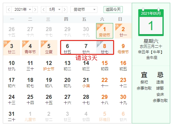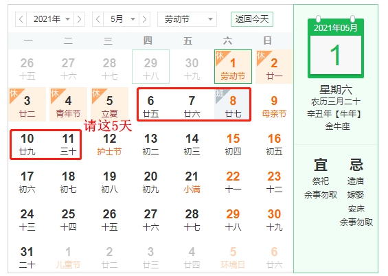 方案二:假期5天,5月6日-8日,加上5月10日和5月11日請假5天,連接5月9日(周日),共休息11天。