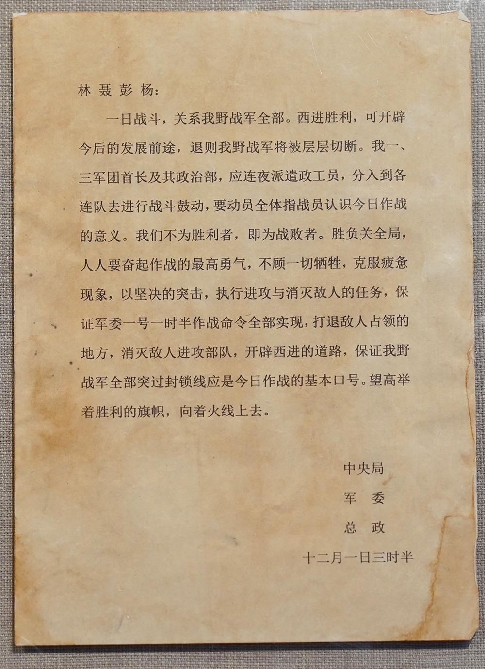 △陳列在湘江戰(zhàn)役紀(jì)念館的電報