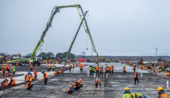 熱火朝天的工地上,“兩山”的建設(shè)者爭分奪秒、馬力全開。這邊鋼筋剛綁扎完,那邊混凝土便從泵管里噴薄而出。
