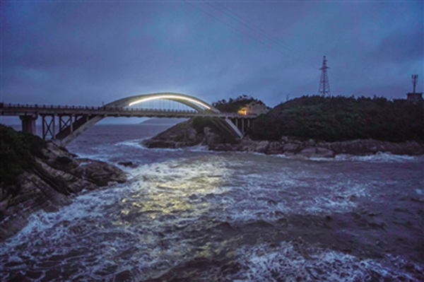 到21時,雨水逐漸稠密,海面水霧彌漫,大潮洶涌,海水翻滾著一浪接著一浪持續(xù)涌向岸基。在風的作用下,海水不斷向西推進的作用力,與海岸的劇烈碰撞發(fā)出一聲聲巨響。