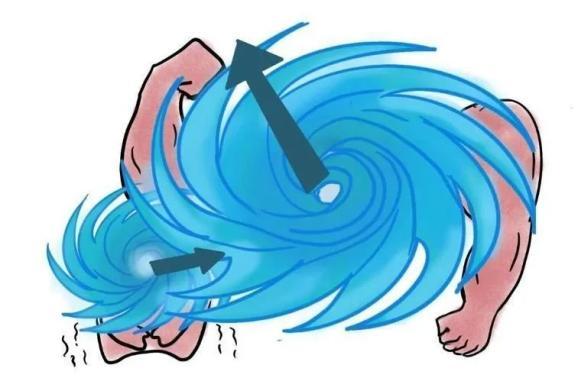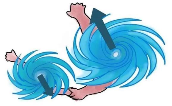 如果兩個臺風(fēng)實力相當(dāng),它們就會繞著同一個中心沿逆時針方向共同轉(zhuǎn)動,“攜手向前”,這便是“相互影響型”。
