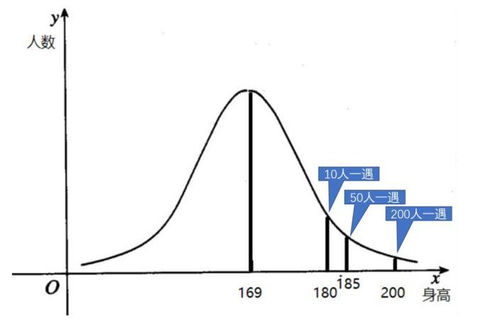 某中學(xué)高三學(xué)生的身高,用1班50人數(shù)據(jù)算得平均身高1.69米,最高者1.85米1人,最矮的1.60米,有5人身高高于1.8米。這個結(jié)果,用統(tǒng)計術(shù)語來表達(dá)就是:1.8米身高“10人一遇”,1.85米身高“50人一遇”,2米身高多少人一遇?我們根據(jù)已有數(shù)據(jù)可以擬合出一個能夠大致反映全班身高的曲線,從這個曲線就可以推算出:2米身高大概需要200人一遇。比如下面這張圖,雖然簡陋,但是應(yīng)該能看懂意思吧。