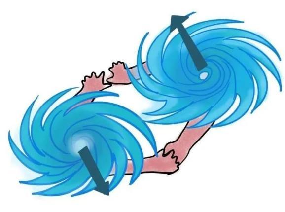 當(dāng)兩個相距較近的臺風(fēng)一強(qiáng)一弱時,較強(qiáng)的臺風(fēng)會“拉著”較弱的臺風(fēng)以逆時針方向繞著自己旋轉(zhuǎn),這就是“單向影響型”。繪圖/趙曉妮(下同)
