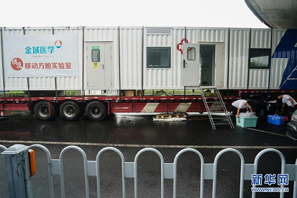 7月27日上午,受臺(tái)風(fēng)“煙花”登陸影響,南京市區(qū)大雨陣陣。在火車(chē)站南廣場(chǎng)一樓的高架橋下,靜靜地停泊著一輛龐大的改裝過(guò)的集裝箱半掛車(chē),它被稱(chēng)作“獵鷹”移動(dòng)方艙實(shí)驗(yàn)室,離進(jìn)站口百余米,因緊急情況且確需離寧的旅客在入站口采集的核酸檢測(cè)樣本將會(huì)被送至這里進(jìn)行檢驗(yàn)。