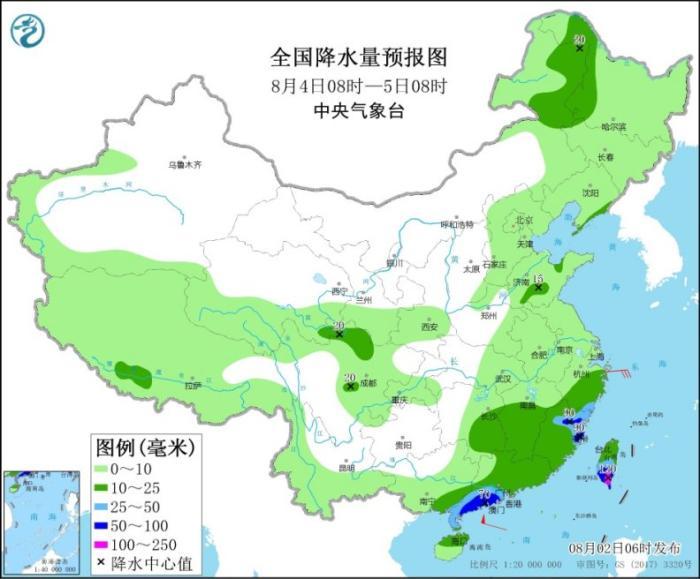 8月4日08時(shí)至5日08時(shí),內(nèi)蒙古東北部、黑龍江西部、四川北部、江南中南部、華南中東部和南部、臺(tái)灣島等地的部分地區(qū)有中到大雨,其中,福建東北部、廣東西南部、臺(tái)灣島南部等地的部分地區(qū)有暴雨或大暴雨(100~120毫米)。