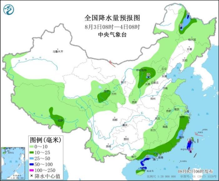 全國降水量預(yù)報(bào)圖(8月2日08時(shí)-3日08時(shí))