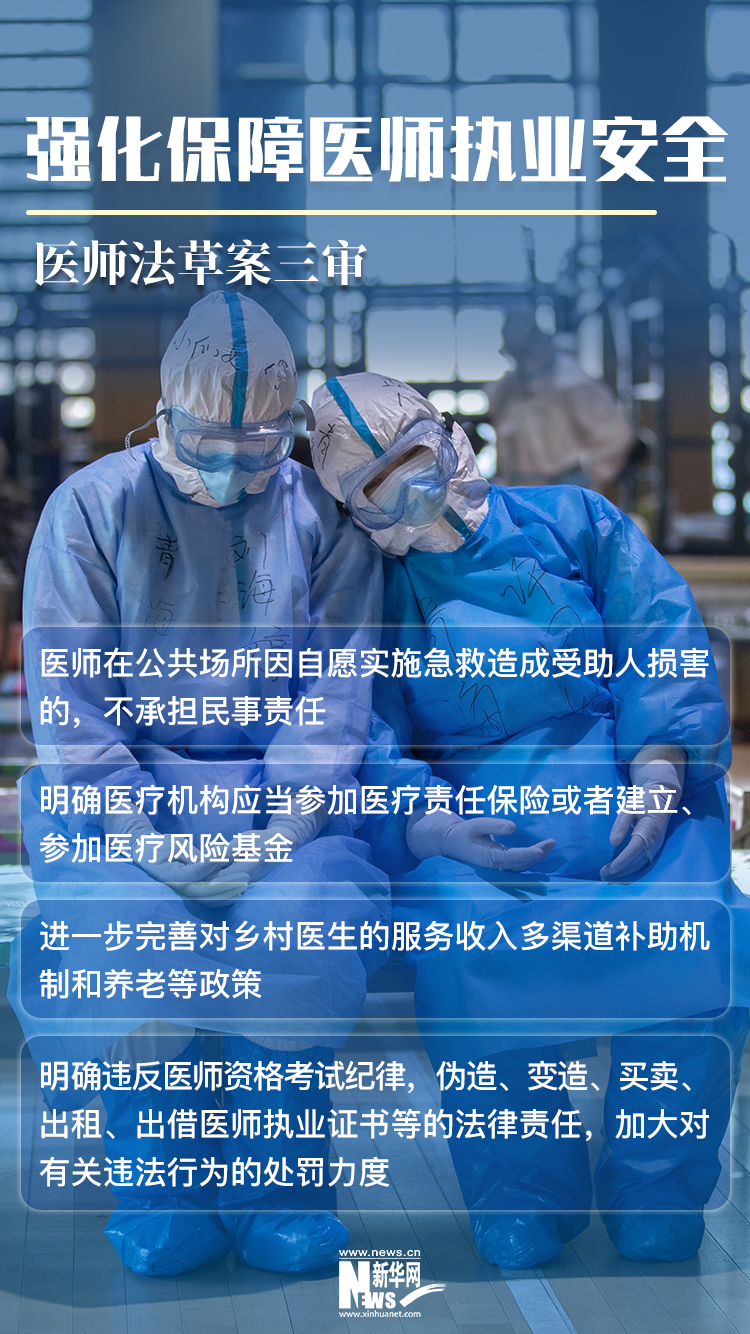 醫(yī)患沖突時有發(fā)生,為加強保障醫(yī)師執(zhí)業(yè)安全,醫(yī)師法草案在總則中明確規(guī)定,醫(yī)師依法執(zhí)業(yè),受法律保護,醫(yī)師的人格尊嚴、人身安全不受侵犯,并專設(shè)一章完善各項保障措施,明確縣級以上人民政府及其有關(guān)部門、醫(yī)療衛(wèi)生機構(gòu)的職責(zé),禁止任何組織或者個人阻礙醫(yī)師依法執(zhí)業(yè),干擾醫(yī)師正常工作、生活。在此基礎(chǔ)上,草案三次審議稿進一步充實完善相關(guān)規(guī)定: