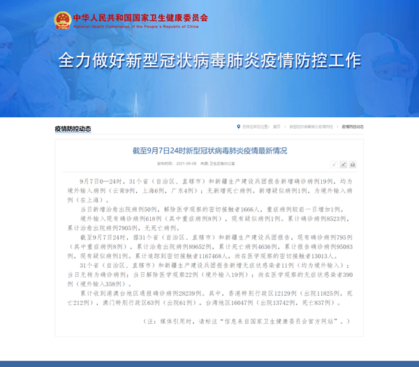 中國網(wǎng)9月8日訊 據(jù)國家衛(wèi)健委網(wǎng)站消息,9月7日0—24時,31個?。ㄗ灾螀^(qū)、直轄市)和新疆生產(chǎn)建設兵團報告新增新冠肺炎確診病例19例,均為境外輸入病例(云南9例,上海6例,廣東4例);無新增死亡病例。新增疑似病例1例,為境外輸入病例(在上海)。