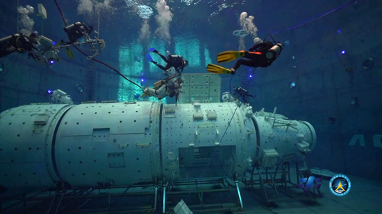 航天員在潛水員的幫助下,接受模擬太空失重的水下訓(xùn)練。 視覺(jué)中國(guó)供圖(資料圖片)