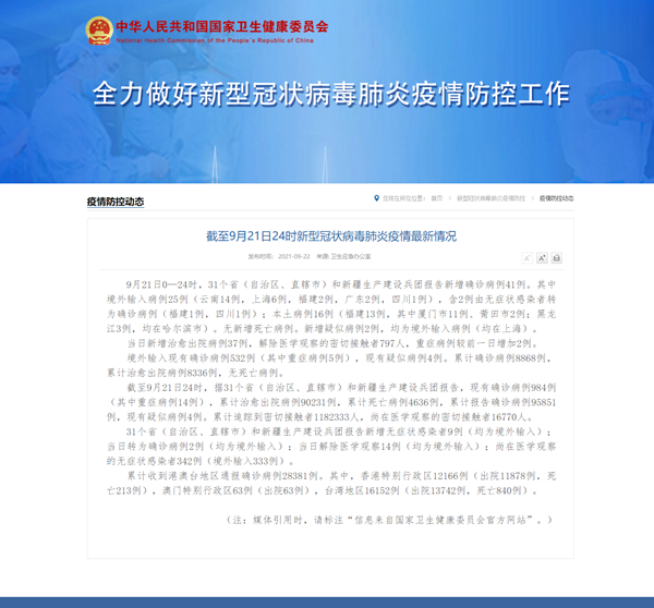 據(jù)國家衛(wèi)健委網(wǎng)站消息,9月21日0—24時(shí),31個(gè)省(自治區(qū)、直轄市)和新疆生產(chǎn)建設(shè)兵團(tuán)報(bào)告新增新冠肺炎確診病例41例。其中境外輸入病例25例(云南14例,上海6例,福建2例,廣東2例,四川1例),含2例由無癥狀感染者轉(zhuǎn)為確診病例(福建1例,四川1例);本土病例16例(福建13例,其中廈門市11例、莆田市2例;黑龍江3例,均在哈爾濱市)。無新增死亡病例。新增疑似病例2例,均為境外輸入病例(均在上海)。