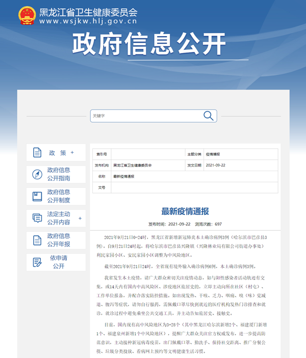 截至2021年9月21日24時(shí),黑龍江全省現(xiàn)有境外輸入確診病例6例,本土確診病例3例。