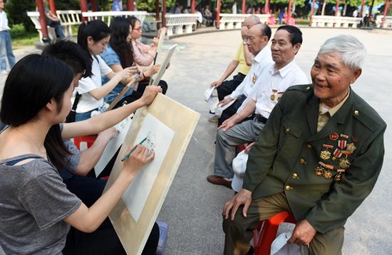 2015年4月28日,安徽省合肥市瑤海區(qū)紅光街道化南社區(qū),來自合肥學(xué)院藝術(shù)系的學(xué)生正在為轄區(qū)黃名君(右一)等勞動(dòng)模范畫像。在“五一”勞動(dòng)節(jié)來臨之際,合肥市瑤海區(qū)紅光街道舉行踐行社會(huì)主義核心價(jià)值觀(敬業(yè)季)主題活動(dòng),大學(xué)生們通過手中的畫筆為43名勞動(dòng)模范代表創(chuàng)作畫像,以此謳歌勞模風(fēng)采,弘揚(yáng)勞模精神。視覺中國供圖