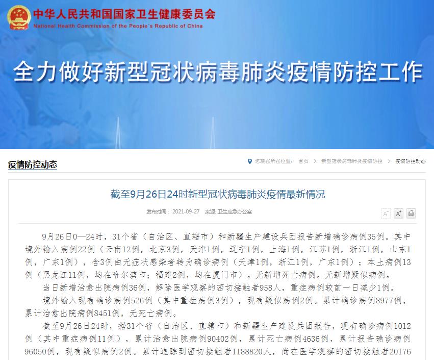 據(jù)國(guó)家衛(wèi)健委網(wǎng)站消息,9月26日0—24時(shí),31個(gè)?。ㄗ灾螀^(qū)、直轄市)和新疆生產(chǎn)建設(shè)兵團(tuán)報(bào)告新增新冠肺炎確診病例35例。其中境外輸入病例22例(云南12例,北京3例,天津1例,遼寧1例,上海1例,江蘇1例,浙江1例,山東1例,廣東1例),含3例由無(wú)癥狀感染者轉(zhuǎn)為確診病例(天津1例,浙江1例,廣東1例);本土病例13例(黑龍江11例,均在哈爾濱市;福建2例,均在廈門市)。無(wú)新增死亡病例。無(wú)新增疑似病例。