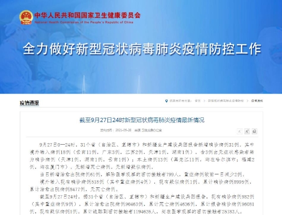 據(jù)國家衛(wèi)健委網(wǎng)站消息,9月27日0—24時(shí),31個(gè)?。ㄗ灾螀^(qū)、直轄市)和新疆生產(chǎn)建設(shè)兵團(tuán)報(bào)告新增新冠肺炎確診病例31例。其中境外輸入病例18例(云南11例,廣東3例,江蘇2例,天津1例,湖南1例),含3例由無癥狀感染者轉(zhuǎn)為確診病例(天津1例,湖南1例,云南1例);本土病例13例(黑龍江11例,均在哈爾濱市;福建2例,均在廈門市)。無新增死亡病例。無新增疑似病例。