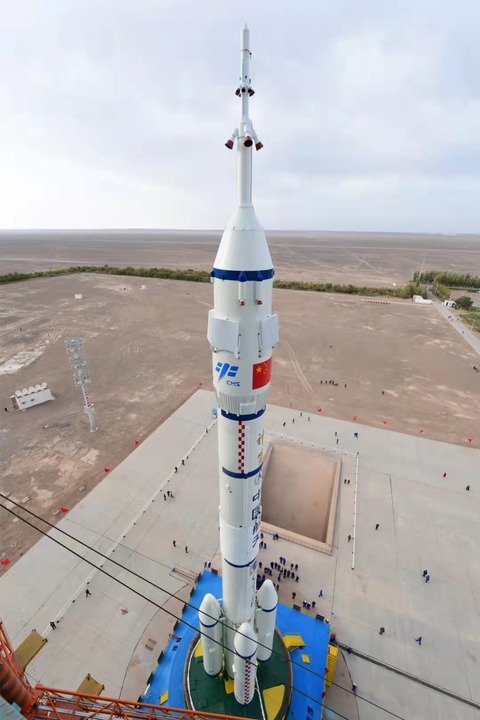 10月7日,神舟十三號(hào)載人飛船與長征二號(hào)F遙十三運(yùn)載火箭組合體已轉(zhuǎn)運(yùn)至發(fā)射區(qū)。新華社發(fā)(汪江波 攝)