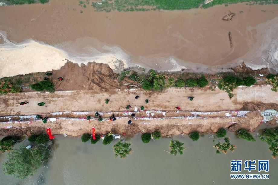 在山西省河津市陽村街道連伯村,搶險人員在加固臨時堤壩(10月10日攝,無人機照片)。新華網(wǎng) 發(fā)(詹彥 攝)