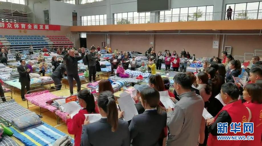 新絳縣體育館臨時安置點里,安置群眾與志愿者合唱。(10月10日攝)新華網(wǎng) 發(fā)(金玉敏 攝)