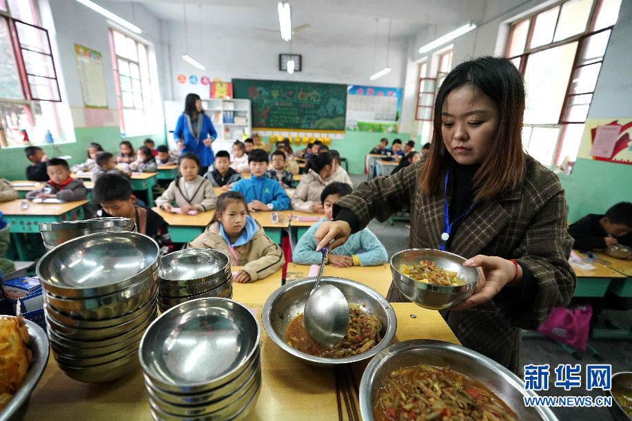 10月11日,在山西省稷山縣清河鎮(zhèn)吳璧小學(xué)安置點,工作人員在給荊平村的孩子盛飯。新華網(wǎng) 發(fā)(詹彥 攝)