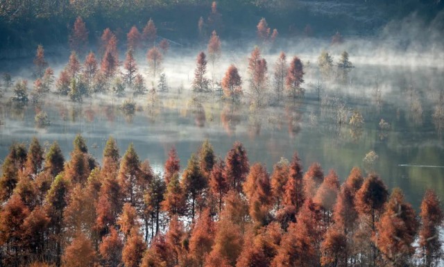 水鳥游過清晨薄霧中的云南省昆明市盤龍區(qū)滇源街道甸尾村水杉濕地