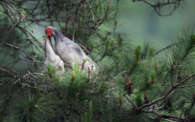 在陜西省洋縣龍亭鎮(zhèn)梁河村一處密林里,一只成鳥朱鹮為幼仔喂食