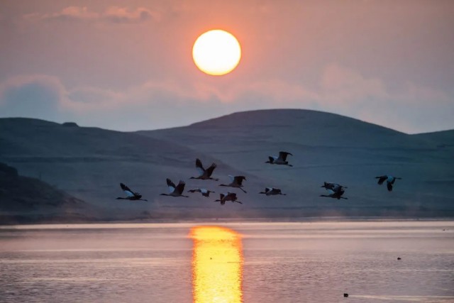 日出時(shí)分,黑頸鶴在云南省昭通市大山包黑頸鶴國(guó)家級(jí)自然保護(hù)區(qū)飛翔