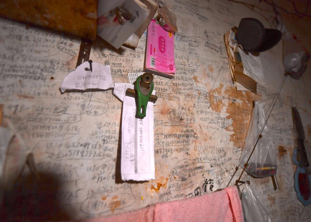 萬佐成和熊庚香家中斑駁的墻壁上寫滿了10多年來患者和家屬留下的電話號碼(2018年1月9日攝)。他們希望老兩口今后也能去他們家中做客。新華社記者胡晨歡攝