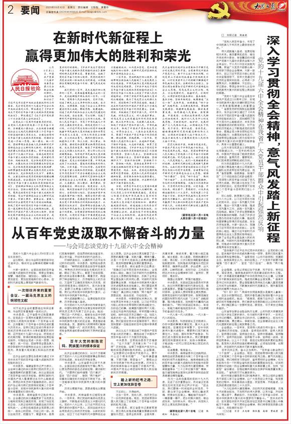 偉大成就催人奮進(jìn),寶貴經(jīng)驗昭示未來。肩負(fù)著承前啟后、繼往開來的偉大使命,舉世矚目的中國共產(chǎn)黨第十九屆中央委員會第六次全體會議,于11月11日在北京勝利閉幕。我省廣大黨員干部群眾第一時間學(xué)習(xí)領(lǐng)會全會精神,大家一致表示,在以習(xí)近平同志為核心的黨中央堅強(qiáng)領(lǐng)導(dǎo)下,百年大黨通過對歷史的全面深刻總結(jié),必將進(jìn)一步凝聚共識、抖擻精神,不忘初心、牢記使命,帶領(lǐng)全體中華兒女在中華民族偉大復(fù)興的新征程上再創(chuàng)新的輝煌。