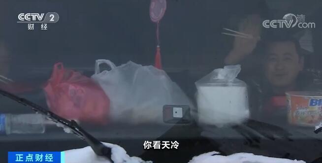 滯留車輛司機:昨天給送的(取暖)油,送的方便面、火腿腸、礦泉水;今天給我送來的熱乎的盒飯,還有水。你看天冷,但是我心里感動。