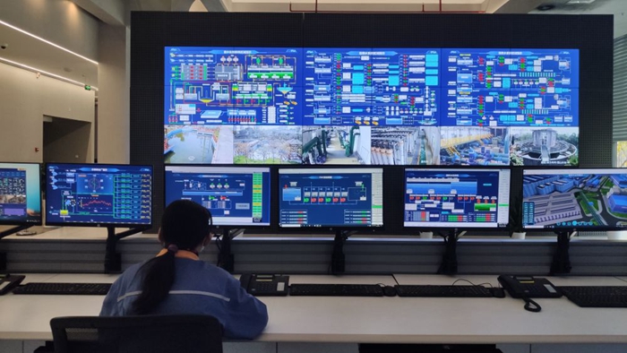 就在距生料車間不遠(yuǎn)處的辦公樓內(nèi),中控室的大屏幕上,顯示著整個工廠的實(shí)時生產(chǎn)畫面。工作人員只用在數(shù)字系統(tǒng)上操作,對應(yīng)的實(shí)體生產(chǎn)環(huán)節(jié)便會按照指令運(yùn)行。