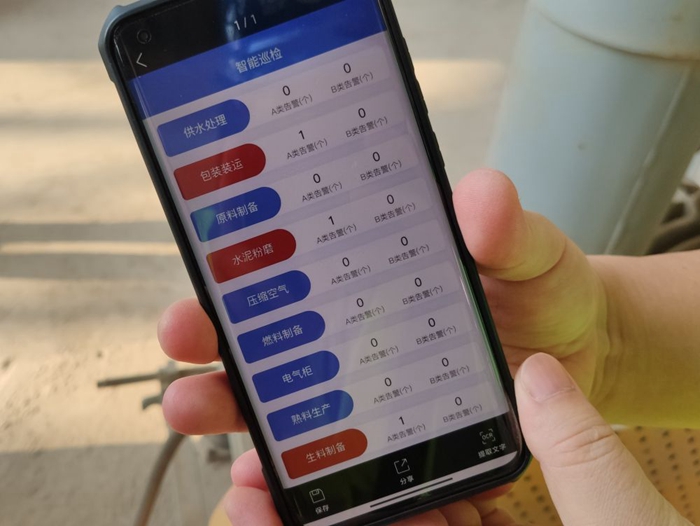 在華新水泥(黃石)有限公司生料車間,現(xiàn)場工作人員正在用手機(jī)查看智能巡檢App。 新華社記者 萬芃琦 攝