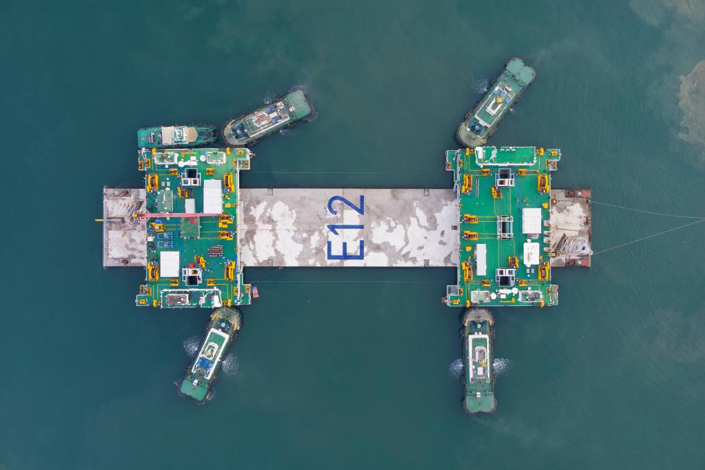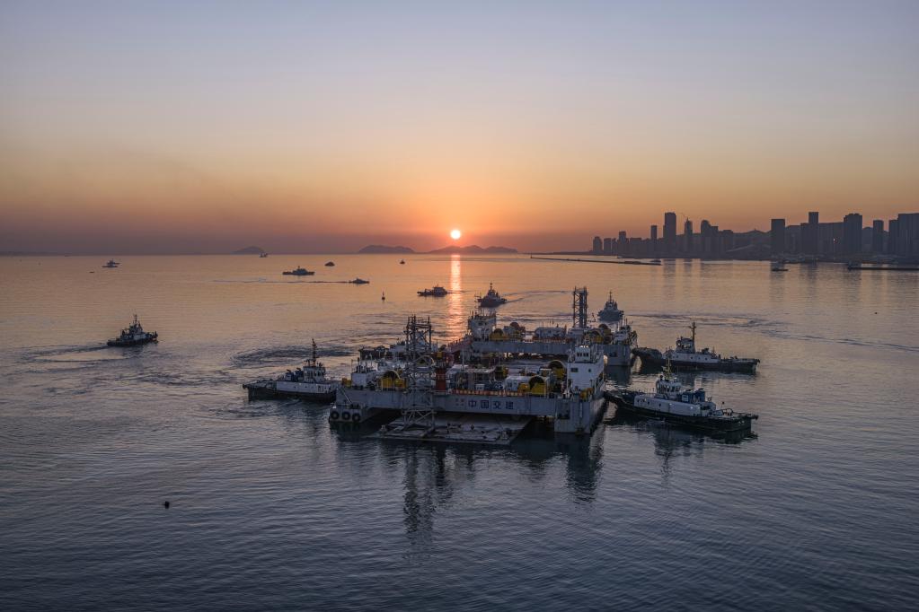 大連灣海底隧道工程施工現(xiàn)場,施工船在浮運(yùn)E12管節(jié)。受訪者供圖