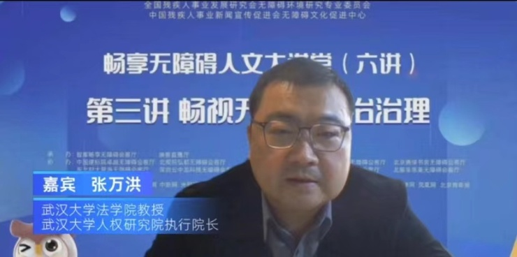 武漢大學(xué)法學(xué)院教授、武漢大學(xué)人權(quán)研究院執(zhí)行院長(zhǎng)張萬(wàn)洪,分享的題目是“推進(jìn)無(wú)障礙環(huán)境法治,完善無(wú)障礙法治環(huán)境”;