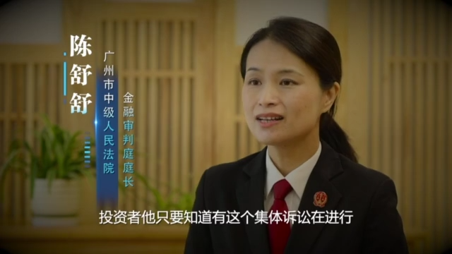 廣州市中級(jí)人民法院金融審判庭庭長陳舒舒:因?yàn)槲覀冞@個(gè)集體訴訟是以默示加入,明示退出的方式來進(jìn)行的,投資者他只要知道有這個(gè)集體訴訟在進(jìn)行,一不花錢,二不花時(shí)間,三也不需要本人來親身參與整個(gè)開庭宣判的過程。