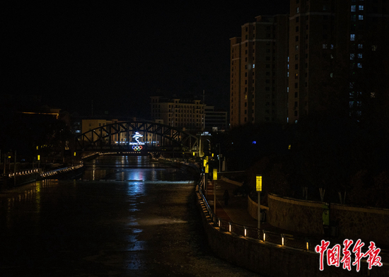 2021年11月20日晚,河北張家口崇禮,橋上亮起2022年冬奧標(biāo)志燈,橋邊的一處建于2015年的樓盤(pán)均價(jià)超過(guò)2萬(wàn)元每平方米。中青報(bào)·中青網(wǎng)記者 李崢苨/攝