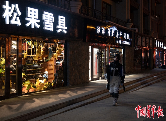 2021年11月20日晚,河北張家口崇禮,一名滑雪者全副武裝,走過(guò)一整條街的雪具店。中青報(bào)·中青網(wǎng)記者 李崢苨/攝