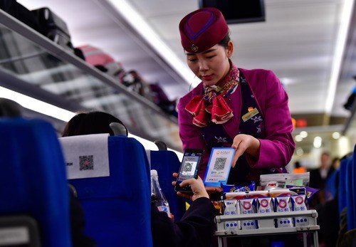 圖為在重慶客運(yùn)段G8516次列車上,一名旅客在使用手機(jī)掃碼支付購買飲用水。