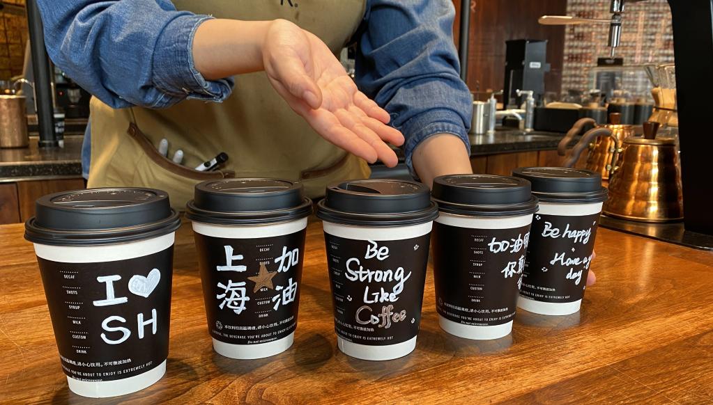 星巴克臻選上海烘焙工坊內(nèi),一位咖啡師繪制的“上海加油”暖心咖啡杯。
