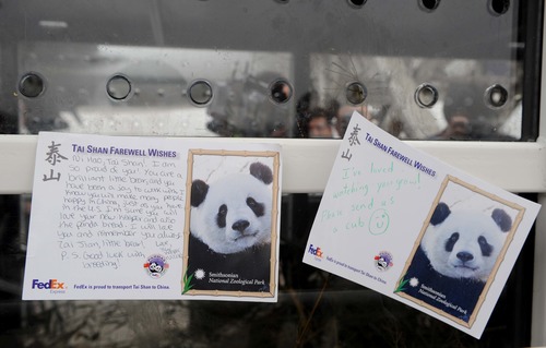 2010年2月5日,裝載著大熊貓“泰山”的箱子上,貼滿了美國大熊貓迷們的祝福。當(dāng)日下午,在美國出生長大的大熊貓“泰山”和“美蘭”乘坐專機(jī)回到家鄉(xiāng)四川。新華社記者陳燮攝