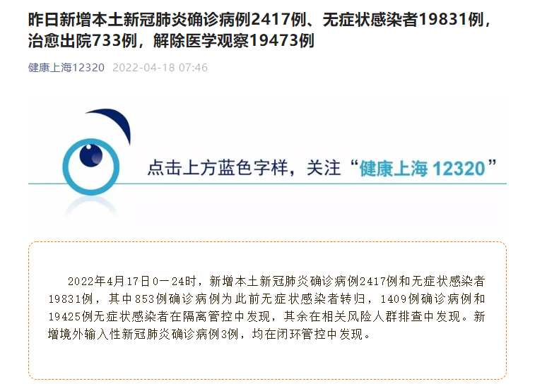 2022年4月17日0—24時(shí),上海新增本土新冠肺炎確診病例2417例和無(wú)癥狀感染者19831例,其中853例確診病例為此前無(wú)癥狀感染者轉(zhuǎn)歸,1409例確診病例和19425例無(wú)癥狀感染者在隔離管控中發(fā)現(xiàn),其余在相關(guān)風(fēng)險(xiǎn)人群排查中發(fā)現(xiàn)。新增境外輸入性新冠肺炎確診病例3例,均在閉環(huán)管控中發(fā)現(xiàn)。