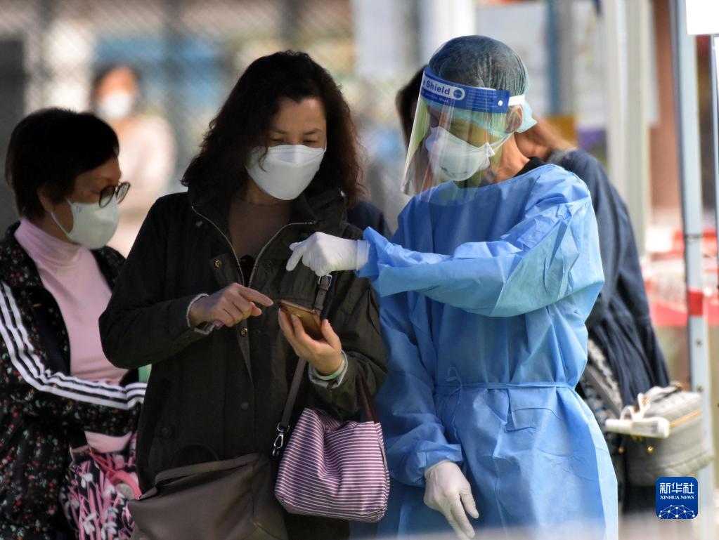 4月19日,在香港旺角流動(dòng)采樣站,工作人員指導(dǎo)市民做核酸檢測(cè)。新華社記者 盧炳輝 攝