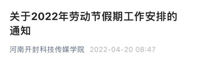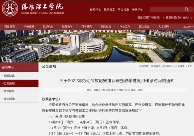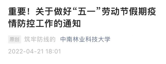 4月21日,中南林業(yè)科技大學(xué)發(fā)布《關(guān)于做好“五一”勞動節(jié)假期疫情防控工作的通知》。文中提到:4月22日至5月8日期間周一至周五正常上班、上課,周六、周日休息(具體教學(xué)安排由教務(wù)處、研究生院另行通知),“五一”勞動節(jié)法定節(jié)假日調(diào)整至暑假補休。
