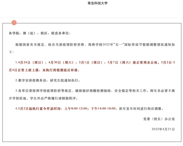此外,青島科技大學(xué)也明確,4月24日(周日)、4月30日(周六)、5月1日(周日)、5月7日(周六)按正常周末公休,5月2日-5月4日正常上班上課。未執(zhí)行的假期延后補放。