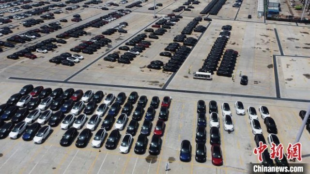 4月21日,剛下生產(chǎn)線的國產(chǎn)特斯拉正一輛輛有序停在工廠內(nèi)?!∫罅⑶?攝