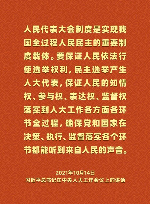 2021年3月,十三屆全國(guó)人大四次會(huì)議通過了關(guān)于修改全國(guó)人大組織法的決定,第一次將習(xí)近平總書記關(guān)于全過程人民民主的重要理念寫入法律,規(guī)定了全國(guó)人大及其常委會(huì)“堅(jiān)持全過程民主”,全國(guó)人大代表“充分發(fā)揮在全過程民主中的作用”,從國(guó)家立法層面為發(fā)展全過程人民民主提供了法治支撐,讓人民當(dāng)家作主在國(guó)家政治生活和社會(huì)生活中得到更加廣泛真實(shí)的體現(xiàn)。