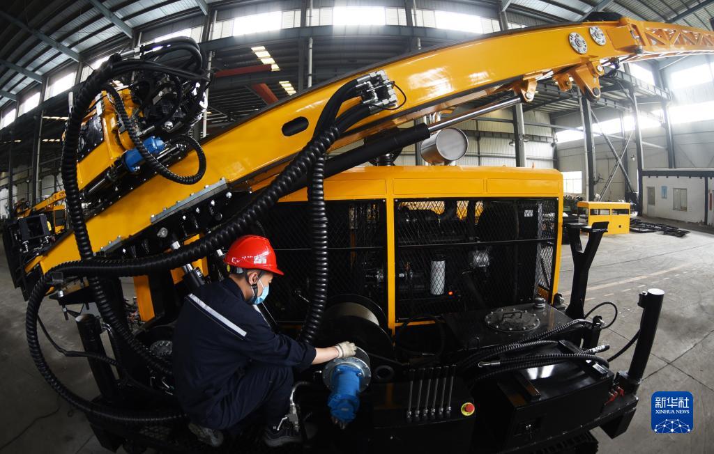 4月27日,在江蘇連云港黃海勘探技術(shù)有限公司,工人組裝一臺液壓勘探鉆機(jī)。