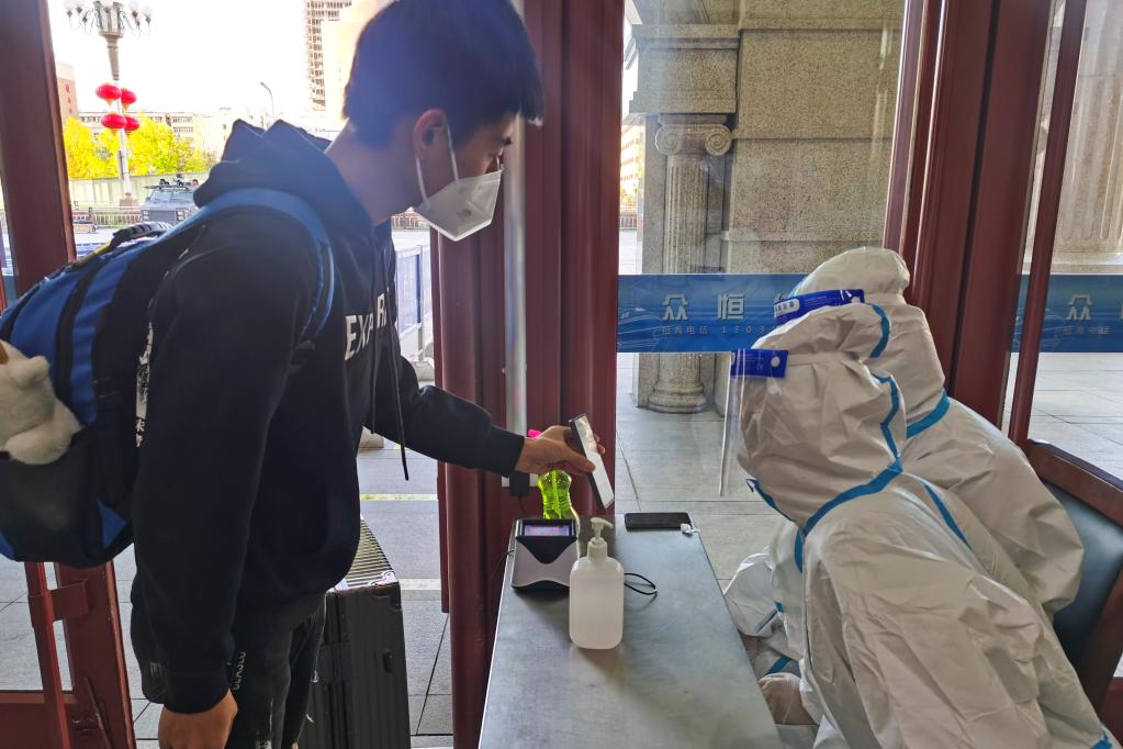 4月30日,在長(zhǎng)春火車站,旅客向工作人員出示健康碼。新華社發(fā)