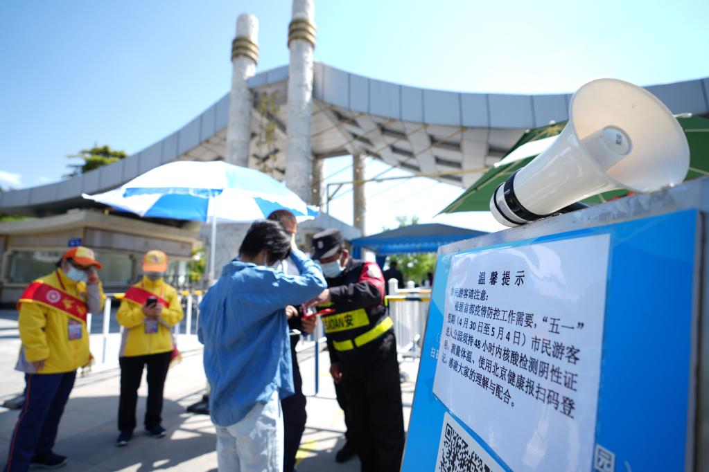 4月30日,北京市龍?zhí)豆珗@北門放置著提示游客進(jìn)入公園須持48小時(shí)內(nèi)核酸檢測(cè)陰性證明的立牌。新華社記者 鞠煥宗 攝