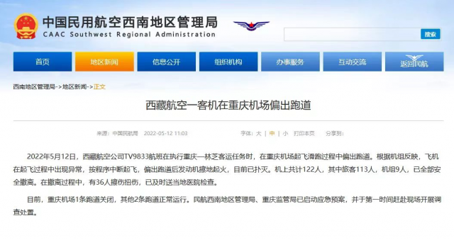 據(jù)中國民用航空西南地區(qū)管理局官網(wǎng)通報(bào),2022年5月12日,西藏航空公司TV9833航班在執(zhí)行重慶—林芝客運(yùn)任務(wù)時,在重慶機(jī)場起飛滑跑過程中偏出跑道。根據(jù)機(jī)組反映,飛機(jī)在起飛過程中出現(xiàn)異常,按程序中斷起飛,偏出跑道后發(fā)動機(jī)擦地起火,目前已撲滅。